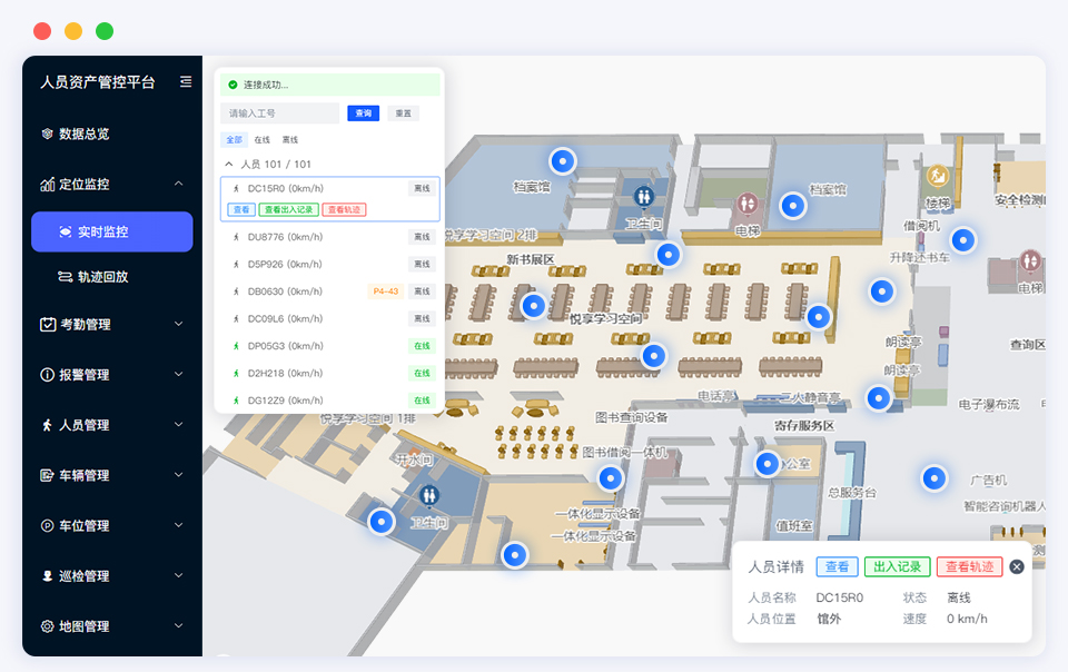 灵活绘制电子围栏,设置出入围栏报警提示支持围栏内超时/超员停留、呼救、消失、未标记等报警