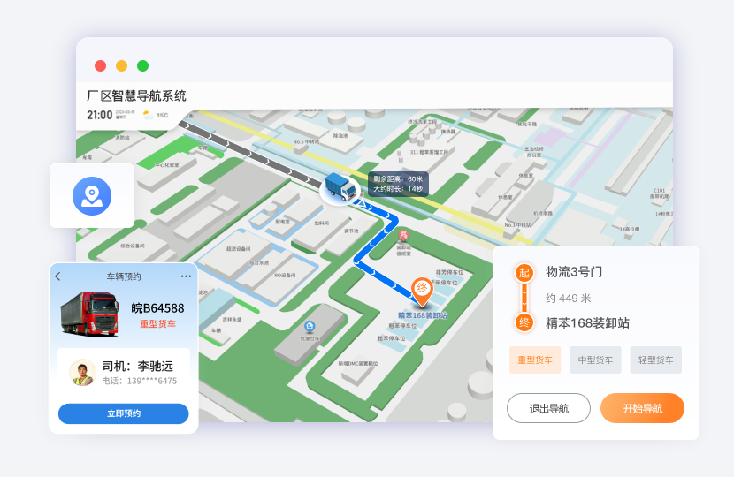 提供车辆预约、卸货地点导航、规定路线导航、车辆分类导航、限高限速提示等多功能导航服务。