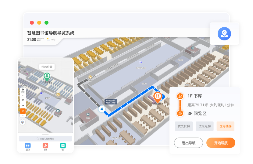 通过手机蓝牙定位,获取读者当前位置,实现实时定位导航,支持跨楼层、楼宇导航。