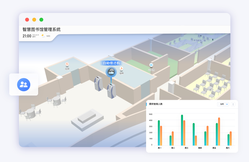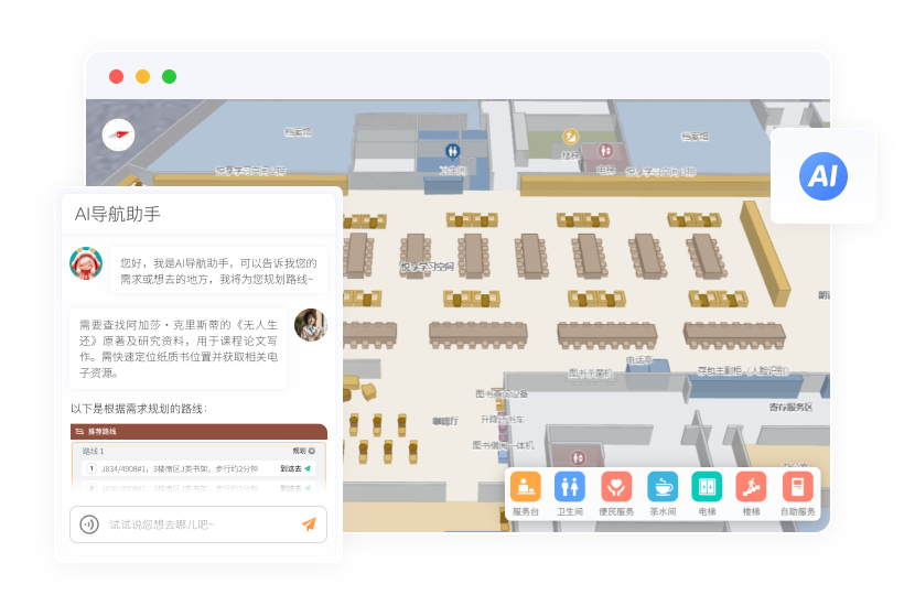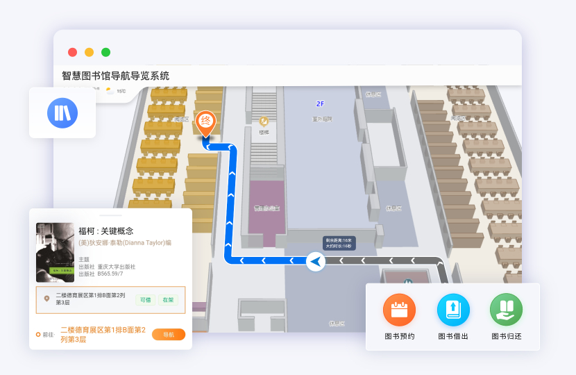 系统支持对接图书借阅系统,实现图书预约、寻书、借出、归还全流程的借阅导航服务。