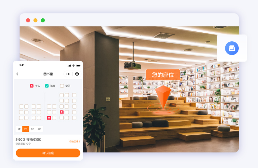 系统对接图书馆座位预约系统,读者预约座位后,一键导航至精准座位位置。