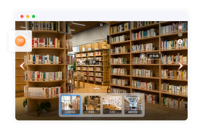 将图书馆阅读区、服务区、图书区、大厅等建筑区域克隆至线上,用户可根据指定路线或自由路线一睹图书馆风采。
