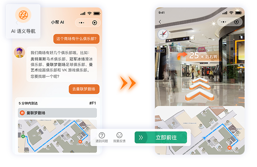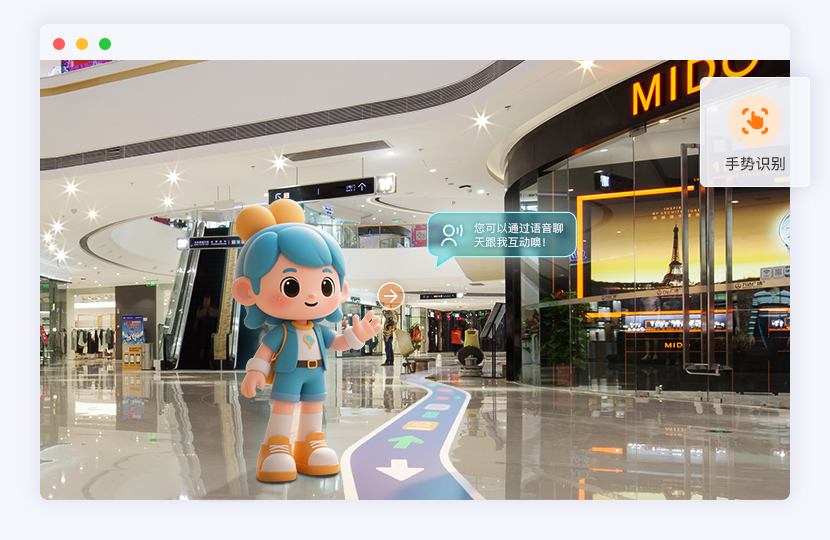 现实场景呈现卡通虚拟数字人指引路径,支持语音交互、手势识别、趣味互动。
