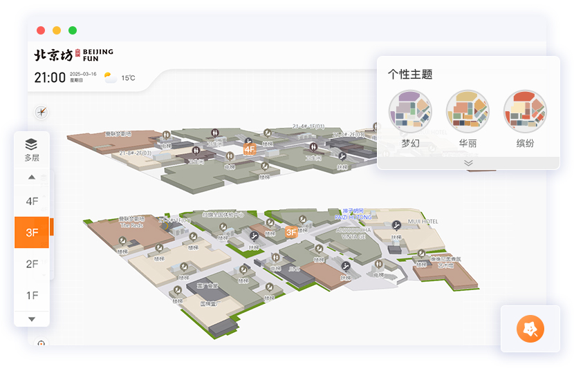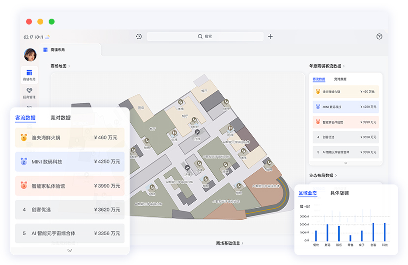 平台将商场业态布局、动线规划、商铺信息以一张图的形式完整展示出来,为品牌方选择更有价值的商铺位置提供空间、环境、业态配比等数据