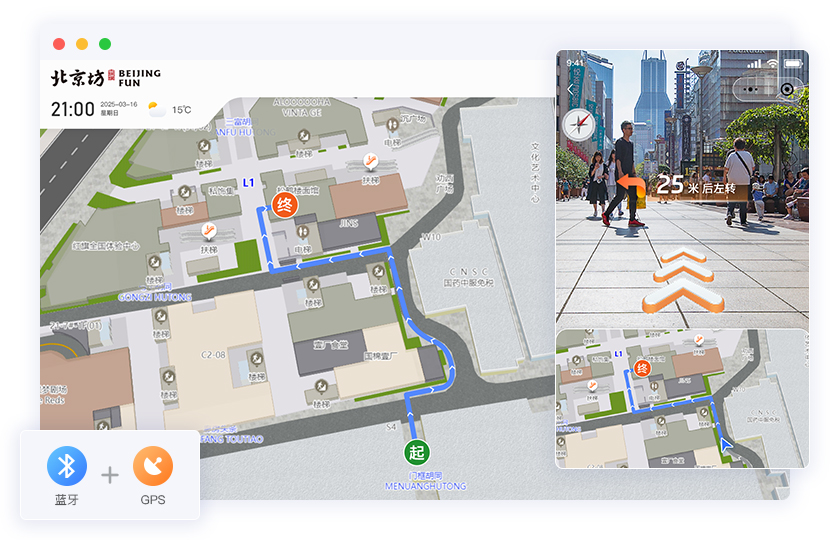 虚拟导航路线与实景画面结合,第一视角实时动态路线指引,方位自动识别与纠偏。