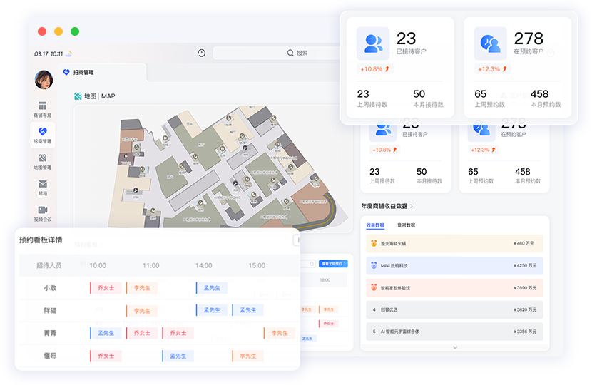后台设置了品牌地图、商铺动态数据统计、客户智能CRM、客户预约系统、资产管理数据库等功能模块,实现招商营销全流程管理。