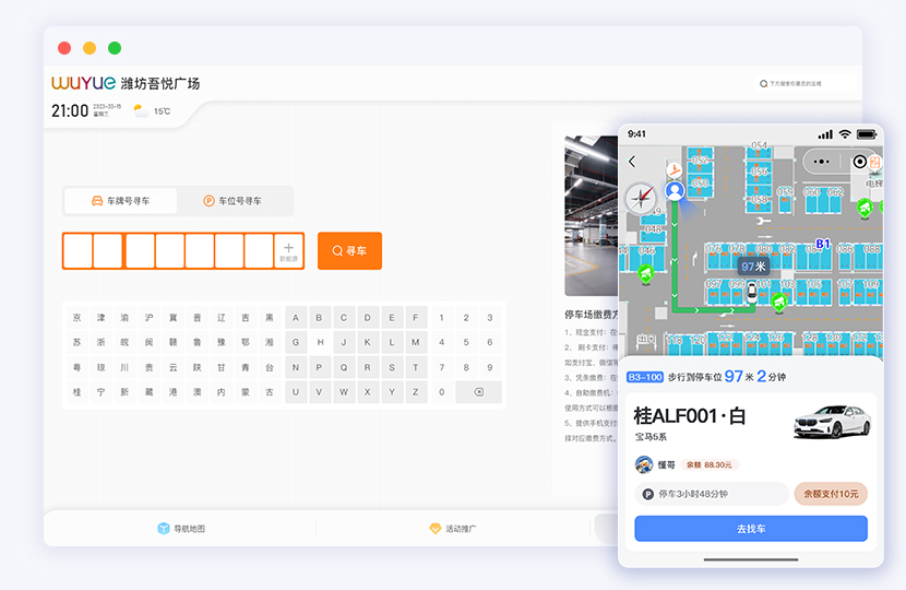 蓝牙定位车辆实时位置,同时提供空闲车位导航路线,实现快速停放车辆。